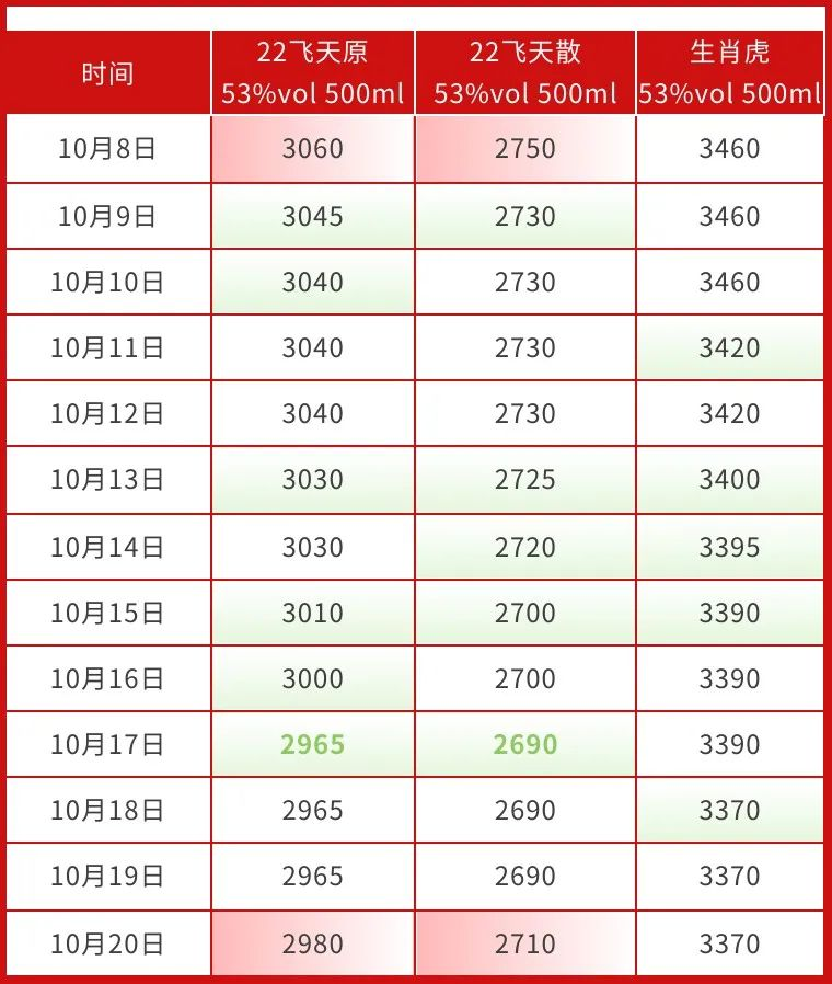 股价低迷的同时,酒价也开始下降,以茅台为例,今日酒价数据显示,10月8日,飞天茅台原箱53%vol 500ml价格3060元,飞天茅台散装53%vol 500ml价格2750元,之后产品价格持续下跌;10月17日,两者分别跌破3000元、2700元大关,酒水市场呈低迷状态;10月20日,飞天茅台原箱53%vol 500ml价格依旧在3000元以下挣扎,为2980元,飞天茅台散装53%vol 500ml价格有所回升,为2710元,两者较10月8日,价格分别下跌80元、40元。