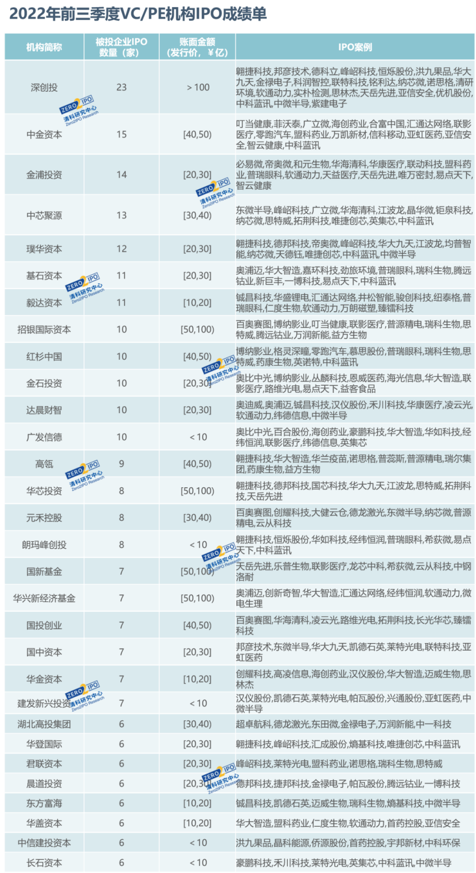 二级市场起起伏伏,VC/PE机构也经历了重重考验。在此阶段,紧跟国家战略发展趋势、长期专注科创领域或坚持“投早投小”的VC/PE机构突破重围。我们看到一系列头部人民币基金交出了一份亮眼的IPO成绩单,如深创投前三季度收获23个IPO,账面金额超100亿元,位列IPO成绩单的第一位。