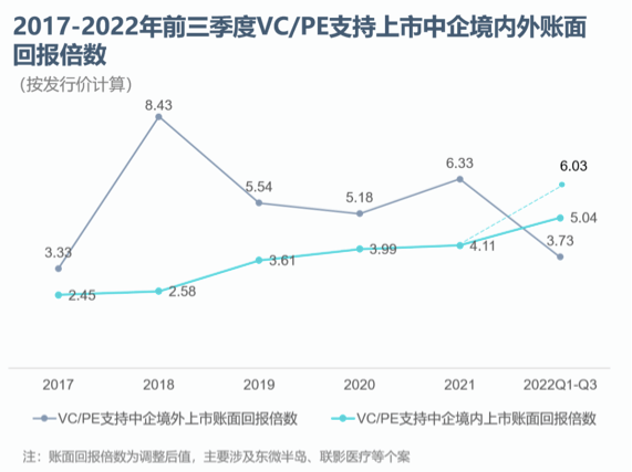 回报方面,2022年前三季度境内市场发行回报水平处于历史高位,VC/PE被投企业在境内上市的平均账面回报倍数(按发行价)为5.04倍,高于2021年整体水平;其中科创板和创业板按发行日、首日以及20日计算的账面回报倍数均高于5倍。