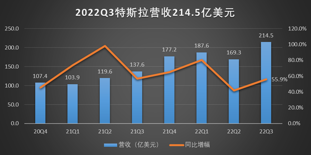 2022年7-9月,特斯拉单季营收规模首次突破200亿美元大关,达到214.5亿美元,较去年同期的137.6亿美元增长55.9%。