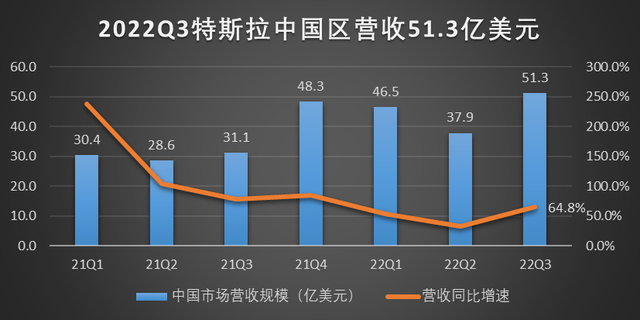财报显示,2022年3季度,特斯拉在中国市场的营收规模达到51.3亿美元,较去年同期的31.1亿美元增长64.8%。这一增速也超过了美国(59.6%)和其他地区(43.9%),让中国成为特斯拉营收增速最快的区域。同时,中国市场占特斯拉总营收的比例也达到了23.9%,而去年同期为22.6%。