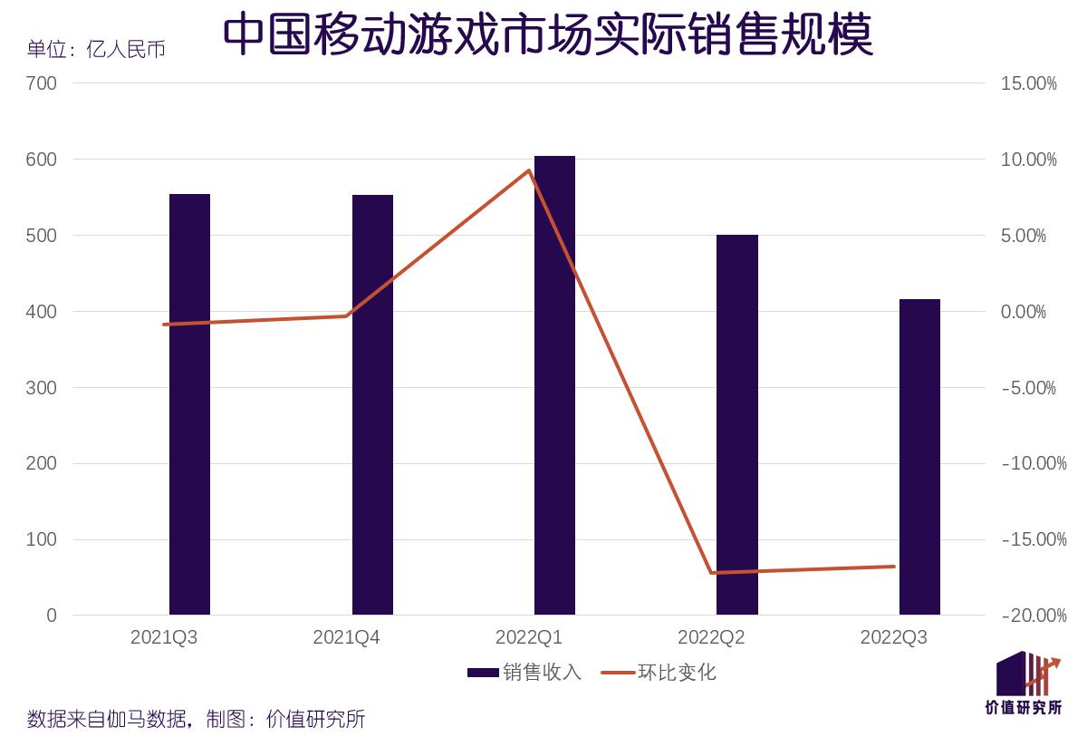 同样来自伽马数据的报告显示,今年三季度中国移动游戏市场实际销售收入为416.43亿元,环比下跌16.79%,这是过去五个季度第四次录得下滑;同比跌幅则高达24.93%,处于历史同期的低谷。