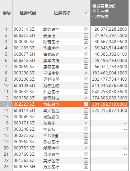 三季报数据显示,今年前三季度,鱼跃医疗研发费用为3.81亿元,占营收比为7.45%,较去年有所提升。但在A股申万三级医疗设备34家公司,按照目前公布三季报的14家数据来看,鱼跃医疗处于靠后位置。