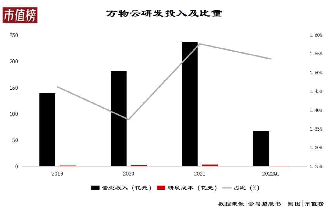 如果仅就传统物业这种劳动密集型行业而言,万物云这个研发比例勉强说得过去,但是作为城市服务商,尤其是主业覆盖AIoT解决方案、BPaaS解决方案服务的云服务商,万物云不足2%的研发投入比就明显低于其他云服务商,甚至低于同属房地产服务行业的贝壳找房,据贝壳财报可知,2021年贝壳找房研发比例约为4%,是万物云的两倍有余。