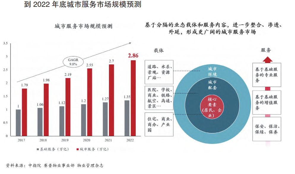 中物研协发布的《2021城市服务物业管理发展报告》同样显示,物管行业仍处于对城市服务领域的探索阶段,业务模式仍未成形。预计到2022年底,城市服务领域市场规模就有望达到2.86万亿,是物业基础服务的4倍。