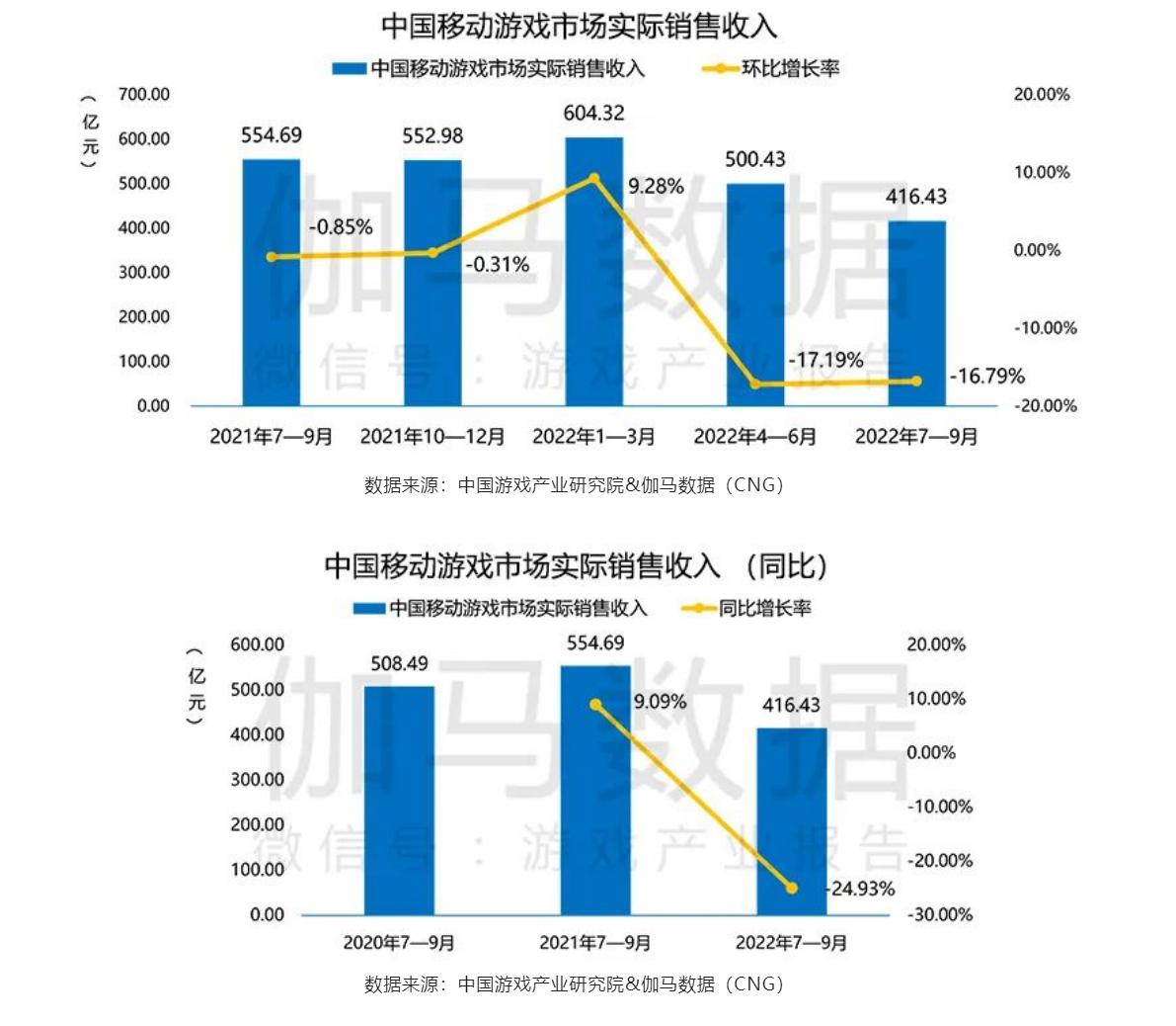 伽马数据上周发布的《2022年第三季度(7—9月)游戏产业报告》显示,Q3中国游戏市场实际销售收入597.03亿元,环比下降12.61%,同比下降19.13%,其中相较于端游的平稳,手游才是下滑的主力,移动游戏市场实际销售收入416.43亿元,环比下降16.79%,同比下降24.93%。同时作为前两年行业增长的新动力,出海也陷入瓶颈期,游戏海外市场实际销售收入为42.62亿美元,环比下降3.91%,连续四个季度呈下降趋势。