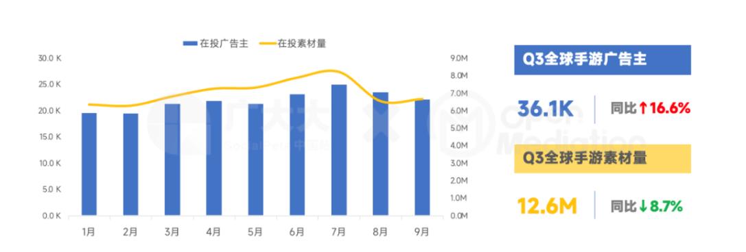 广大大数据研究院联合移动出海服务平台OpenMediation发布《2022Q3全球手游营销报告》显示,Q3累计抓取手游广告主超3.6万名,同比增长16.6%。每月在投广告主数量呈现阶梯上升趋势,每月平均投放广告主超2.2万名。Q3手游下载量同比增长6%,环比增长2%,增长量超1亿次。Q3季度用户活跃体量同比上涨11%,增长量直逼3个亿。