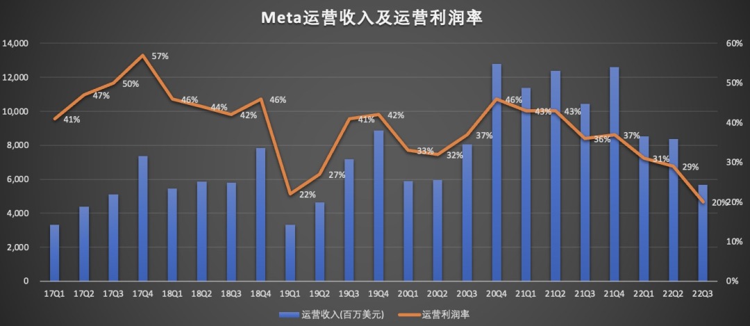 该项指标的下滑,导致公司营业利润和运营利润率下滑。数据显示,三季度Meta的营业利润为56.64亿美元,同比减少46%,运营利润率从上年同期的36%降至本季度的20%。