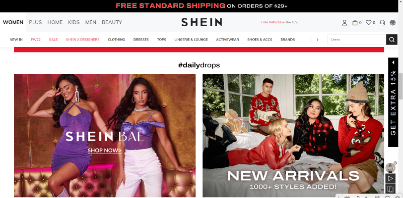 从主页看,拼多多偏向小物件售卖,和国内的商品模式一致,而SHEIN尽管涉及其它品类,但主打的还是女性服装。