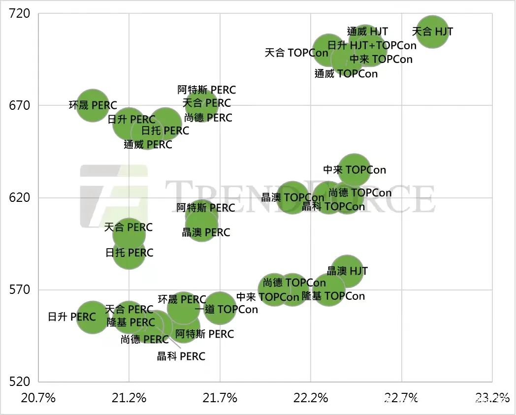 产品力竞争力不够还体现在其功率、转化率相比头部几家产品还有差距——在今年9月份拉美展上,比亚迪公布的一个产品最高达到705W+,而在2021年头部们已达到该水平。