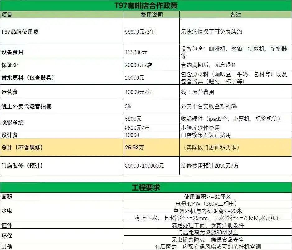 26.92万元的各项加盟费用,再加上门店装修、房租以及员工成本,想要落地一家T97咖啡门店的前期投入大概在50-60万之间。