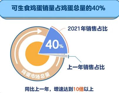 在生鲜平台盒马,同样具有类似趋势——可生食鸡蛋的增速达到10倍以上,且销量占到了鸡蛋品类的40%。