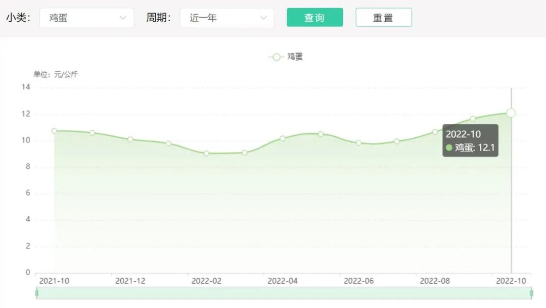 今年10月,全国市场的普通鸡蛋平均批发价为12.1元/公斤。