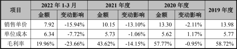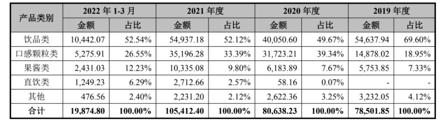 招股书显示,2021年,口感颗粒类产品销售价格下降,导致鲜活饮品销售收入占比由上年的39.34%下跌至33.39%,毛利率由上年的 57.77%下降至43.62%,综合导致主营业务毛利率下降 8.16%。