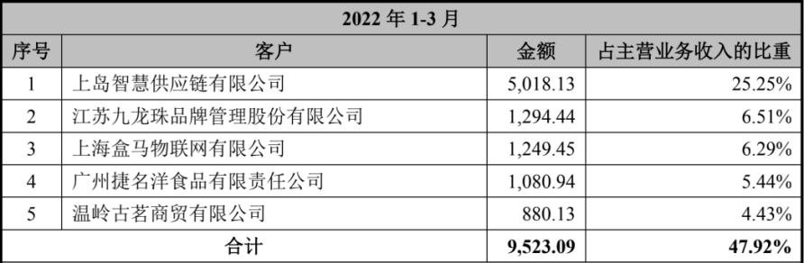 如其他新茶饮供应商一般,鲜活饮品也患有“大客户”依赖症,目前其前五大客户占主营收比例47.92%,包括蜜雪冰城(上岛智慧供应链有限公司)、盒马和古茗等。