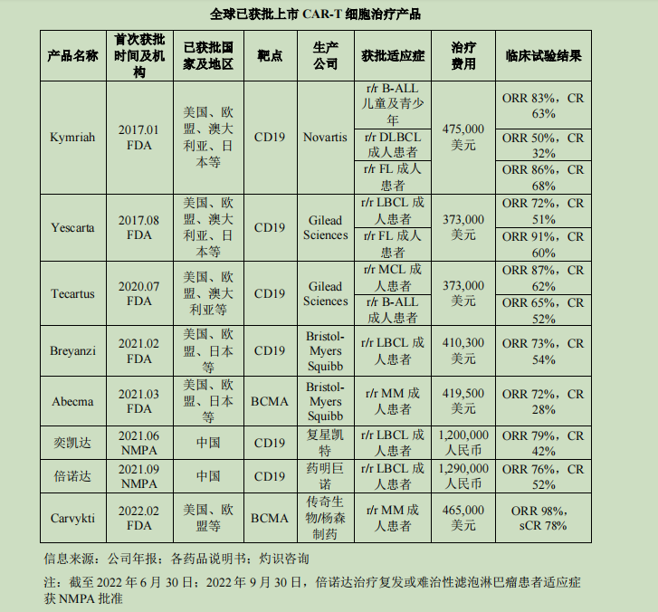 值得注意的是,行业内卷十分严重。截至2022年6月30日,全球共有8款上市的CAR-T细胞治疗产品,其中国外上市的CAR-T细胞治疗产品包括 Kymriah, Yescarta, Tecartus, Breyanzi, Abecma 和 Carvykti,国内上市的CAR-T细胞治疗产品包括奕凯达以及倍诺达。2021年6月23日复星凯特的奕凯达在NMPA获批上市,成为中国首款获批上市的CAR-T细胞治疗产品。