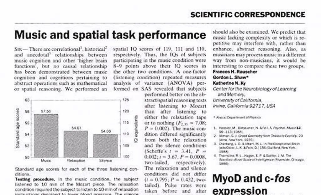 上世纪90年代,美国加州大学学习和记忆神经生物学中心(CNLM)在《自然》上发表一篇研究论文,称经36名大学生参与实验证明,聆听莫扎特音乐有助于“空间推理能力”的提升。后来经由动物实验表明,在母体中聆听过音乐的小鸡和老鼠都显示增强了辨位导航的能力,而经媒体发酵之后,这一理论也被演变成“听莫扎特乐曲能变聪明”。