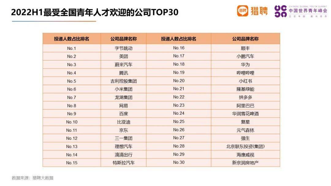 在国内上半年全国青年人才投递的公司TOP30中,包含了字节跳动、美团、蔚来、吉利、比亚迪、三一集团、特斯拉等涉及的基本是互联网、新造车、机械制造等科技互联网厂商,因此,从职业发展前景来看,这些科技大厂代表着时代的趋势与未来。