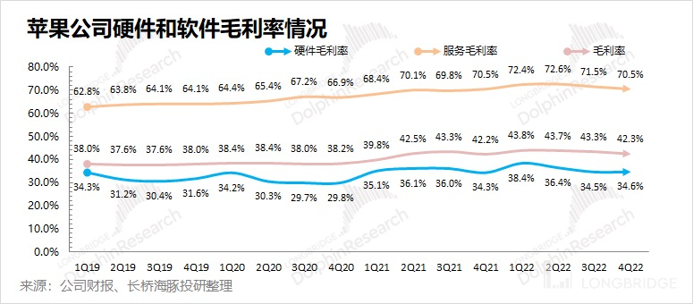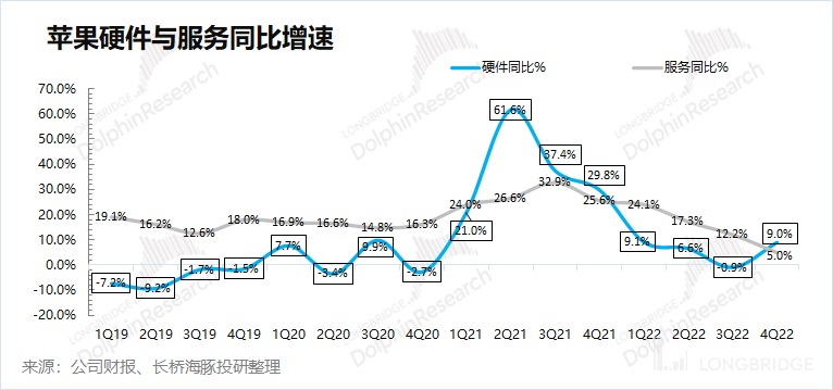 ③软件服务:两个核心硬件外的软实力。市场对苹果一直是软硬一体化的看待,而现在的苹果软实力也越来越弱,从过去两位数的增长跌落至本季度的 5% 增长。软实力的坍塌,一部分是硬件出货增速放缓,影响了用户量的增长;另一部分是宏观经济影响用户的付费意愿。而这两部分在短期内都未见起色,软件服务短期内难回过往高增长。