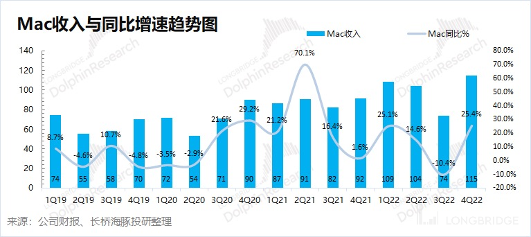 2022 财年第四季度 Mac 业务收入 115 亿美元,同比增长 25.4%,远超彭博一致预期(92.5 亿美元)。本季度 Mac 业务大超市场预期的原因在于受二季度疫情等因素影响供应端问题得到恢复。