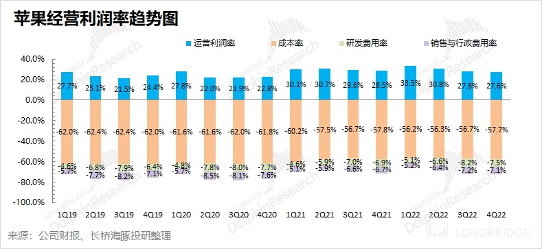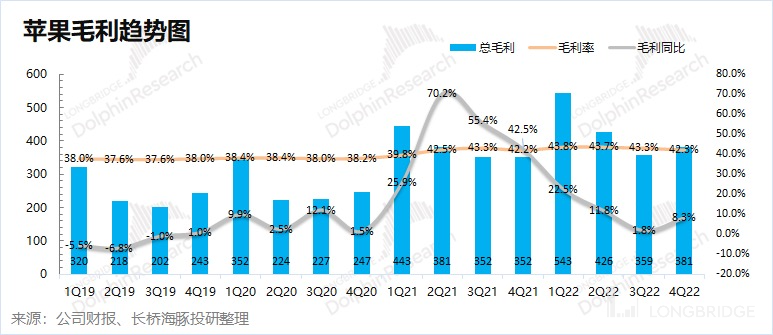 1.2 毛利率:2022 财年第四季度苹果公司毛利率 42.3%,同比持平,符合彭博一致预期(42.2%)。本季度苹果公司毛利率略有松动,但仍继续维持在 42% 以上的高位。