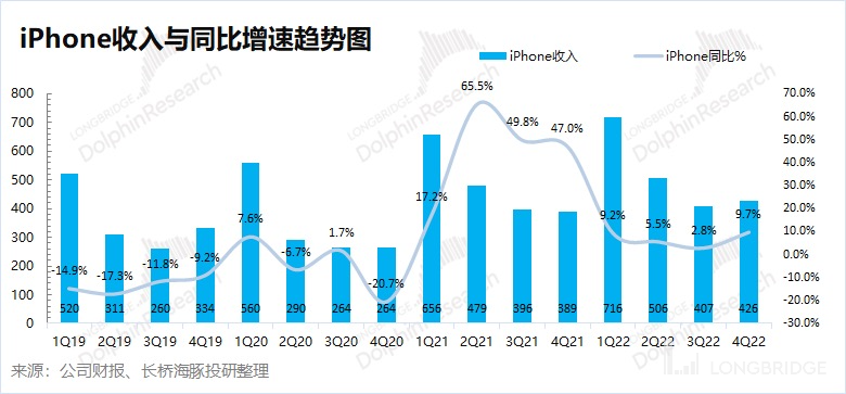 2022 财年第四季度 iPhone 业务收入 426 亿美元,同比增长 9.7%,基本符合彭博一致预期(426.7 亿美元)。本季度整体手机市场继续低迷,在整体市场近 10% 的下滑中,苹果凭借市占率提升和产品结构调整,再获增长已实属不易。