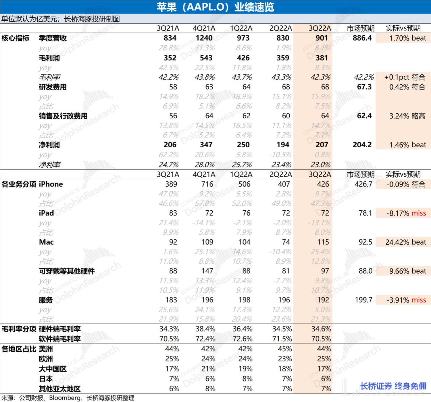 1、整体业绩:基本符合市场预期。苹果公司本季度实现营收 901 亿美元,同比增长 8.1%,略超彭博一致预期(886 亿美元)。本季度能达到市场预期,主要是由于 Mac 业务和可穿戴等硬件产品取得了超出市场预期的表现。苹果公司本季度毛利率 42.3%,同比基本持平,符合彭博一致预期(42.2%)。软件端毛利率有所下滑,但仍保持维持 70% 以上的高位,而本季度硬件端毛利率抵住了受通胀等带来的成本压力。