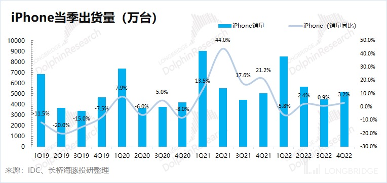 2、iPhone:低迷市场中的卷王,实属不易。本季度全球手机市场近两位数的下滑中,iPhone 业务还能继续增长,主要得益于 iPhone 在市场中份额提升和产品均价的提高。海豚君估算$苹果.US 本季度手机出货量仍有个位数增长,同时价格端受益于产品组合的调整也有个位数增长的表现。