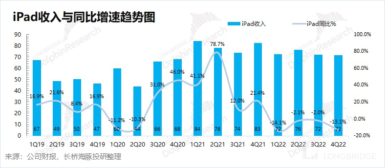从公司规划上并未把 iPad 作为当前公司主要关注点,虽然公司 10 月发布 iPad 新品,但并没有进行发布会造势。海豚君认为 iPad 业务虽然没有疫情期间的爆量表现,但整体业务在疫情退却的下滑之后,有望维持平稳。