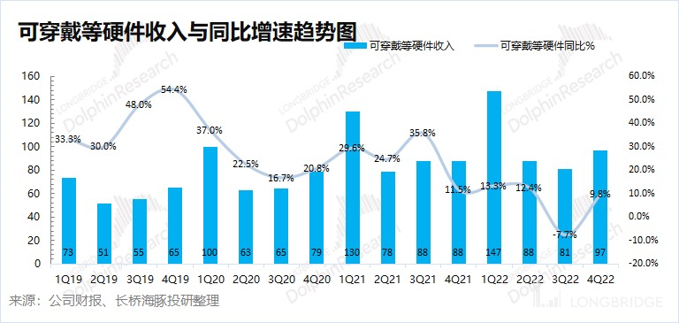 可穿戴,家用和配件等其他硬件产品,都是以创新驱动为主的可选消费。而宏观经济环境,对可选消费有较大的影响。而今可穿戴等硬件产品的创新又凸显不足,很难刺激需求的继续增长。虽然本次苹果有新品发布,但未见爆品亮相。在下一个爆品/创新出现之前,可穿戴等其他硬件业务很难再回到之前的高增。