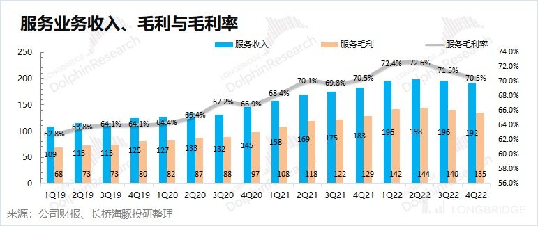 2022 财年第四季度软件服务收入 192 亿美元,同比增长 5%,低于彭博一致预期(199.7 亿美元)。软件服务增速一再下滑,首次进入个位数增长。