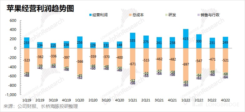 1.3 经营利润:2022 财年第四季度苹果公司经营利润 249 亿美元,同比增长 4.7%,略超彭博一致预期(245 亿美元)。经营利润重回正增长,本季度的超预期表现,最主要得益于收入端的超预期表现。