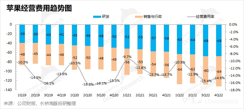 本季度苹果公司的经营费用率 14.6%,同比增长 0.9pct,基本符合市场预期。在本季度中销售与行政费用率和研发费用率均有提升,如市场所预期,在疫情后随着工资的上涨,预期是研发费用上涨明显。