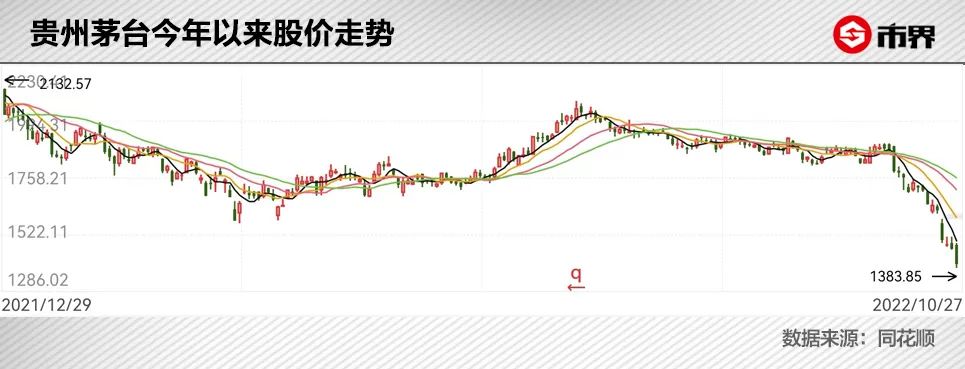 然而,一年过去了,不光未见3000元踪影,贵州茅台还跌个不停。截至2022年10月27日收盘,贵州茅台股价为1401元/股,总市值不足1.76万亿元。