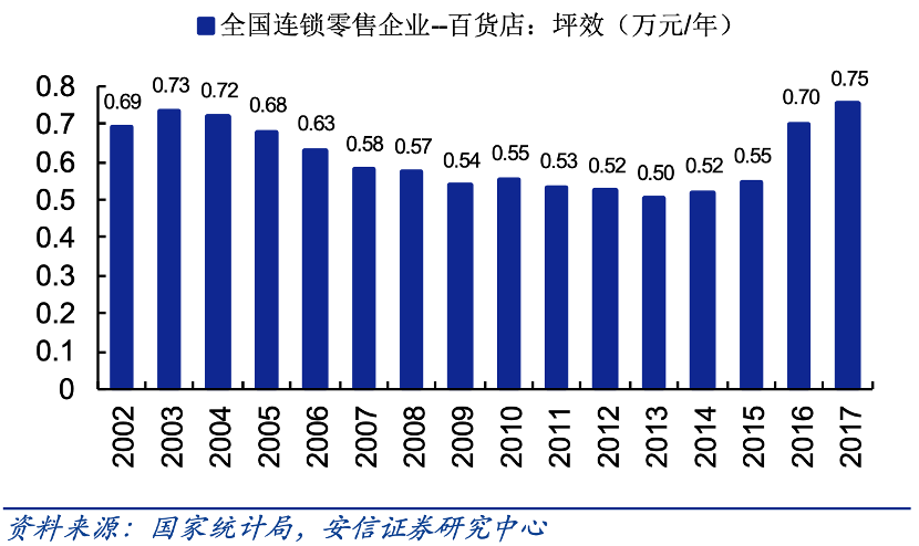 安信证券所制全国连锁百货店坪效走势图也很能说明此问题,见下图
