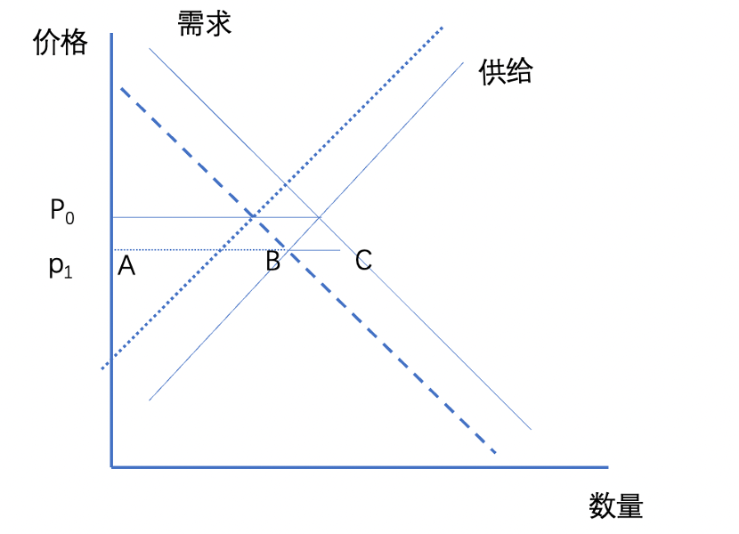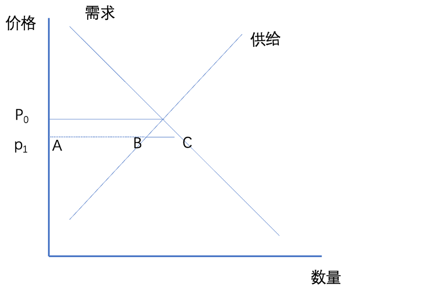 由于线上交易没有地域和时间限制,且价格优势很容易被放大形成规模效应(比价和评测网站在其中充当放大乘数)。我们假设线下参照线上高折扣定价,短期内由P0降到P1,这就意味着供给曲线在短期内会出现错配,也就是说当价格下降,市场只能满足AB段的需求,BC段需求将无法满足。
