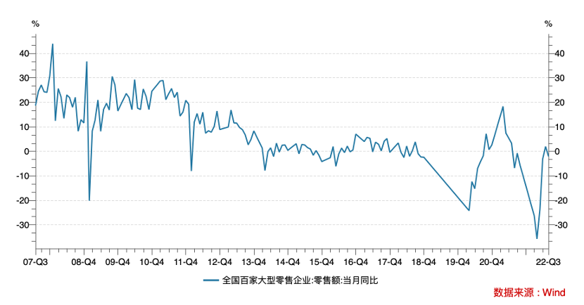 整理全国百家大型零售企业营业额之后,会很直观看到固然在2016年前后行业有一次“中兴之举”,零售额同比增长表现好转,但2018年后行业又开始回到负增长。