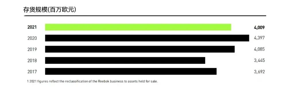对于服装企业而言,产品、渠道不给力造成的最终结果就是库存积压。2020年和2021年,阿迪达斯库存占营收的比重为24.2%和18.9%,分别比安踏高了8.8和3.4个百分点。