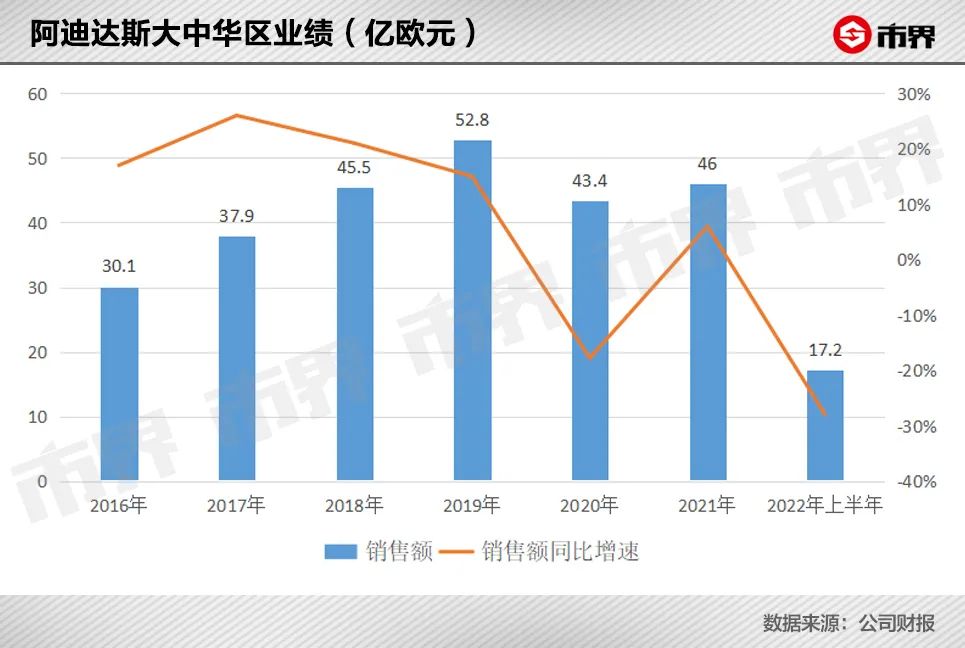 分地区来看,阿迪达斯在中国市场的表现更差。大中华区曾是阿迪达斯业绩增长的重要支撑,2019年公司还在年报中提到,其大中华区业绩已连续五年快速增长。但2021年开始,阿迪达斯在中国的业绩逐渐下滑,就连市场占有率第二的“宝座”,也被国产品牌安踏取而代之。