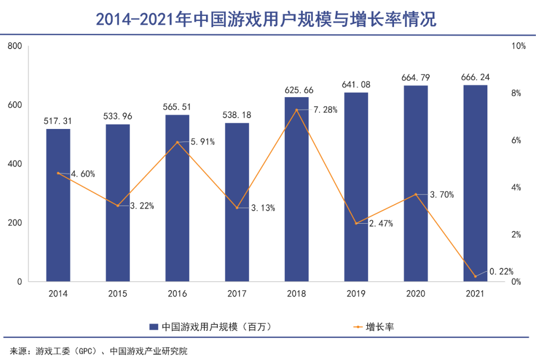 根据游戏工委(GPC)、中国游戏产业研究院联合发布的《2021年中国游戏产业报告》显示,2021年中国游戏产业实际销售收入为2,965.13亿元,同比增长6.40%。中国游戏市场用户规模为6.66亿,同比增长0.22%。