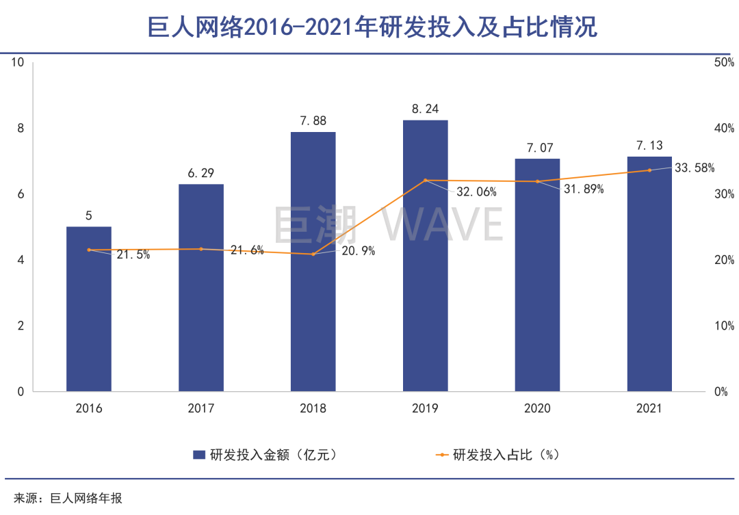实际上,这些年巨人网络的研发支出相当高,占营业收入比例常年在20%以上,近三年来甚至在三分之一左右,这在同行业来说都是数一数二。