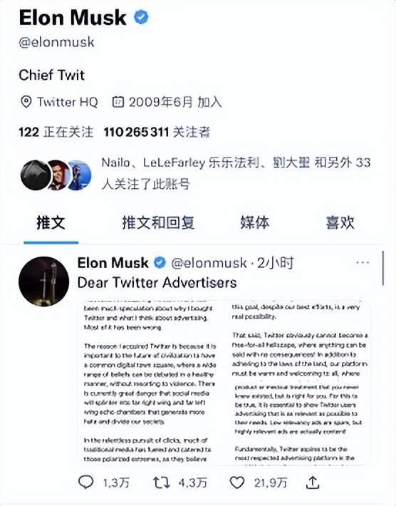 北京时间10月27日晚间,马斯克在推特发布《告推特广告主书》,一共三张纯文字图片,这对于见天儿嬉笑怒骂的马斯克来说相当正经,足见其严肃(或者说希望外界相信他很严肃)。
