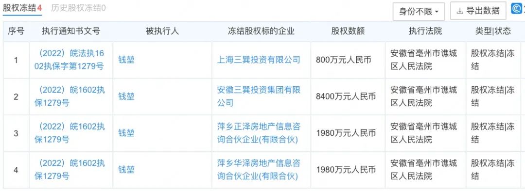 除陷入诉讼纠纷之外,近段时间以来,作为三巽老板钱堃麻烦也不断,连遭股权冻结。9月5日,钱堃所持萍乡华泽房地产信息咨询合伙企业(有限合伙)1980万元股权被冻结;短短4天后,他所持三巽投资800万元股权被冻结。