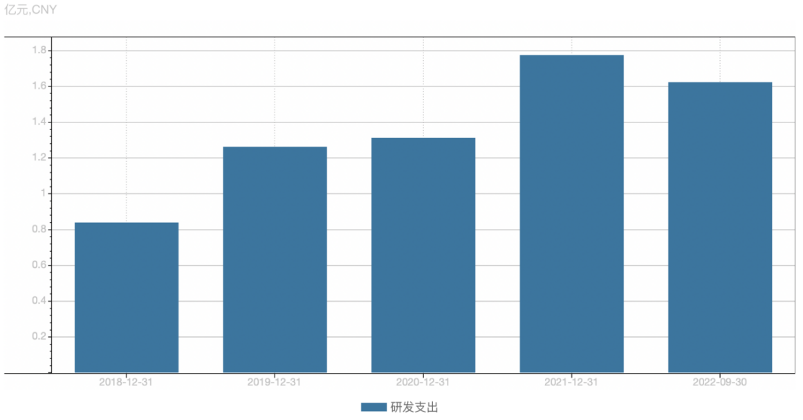 数据显示,2018年-2021年,公司研发投入分别达到0.84亿元、1.26亿元、1.31亿元和1.77亿元,逐年递增。今年前三季度,研发投入就已经超过1.6亿元。