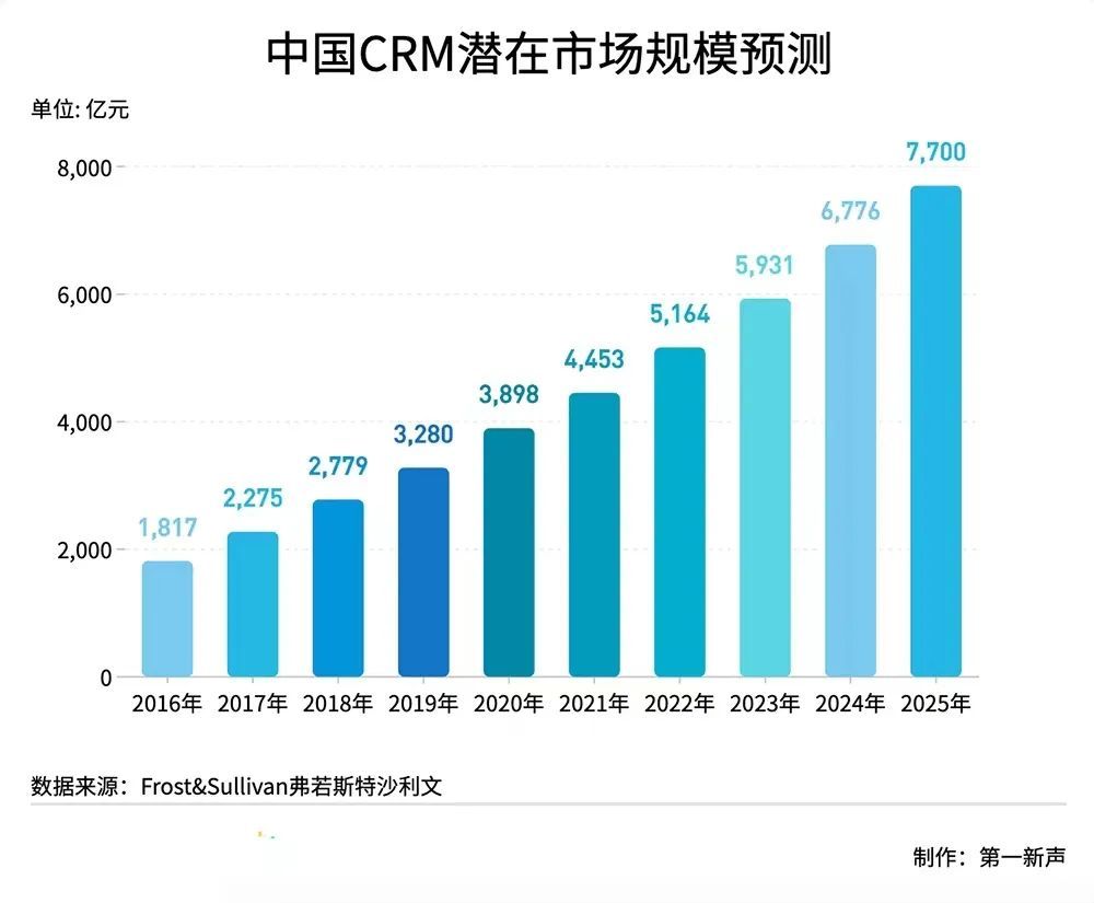 过去近十年里,不管是全球还是中国,CRM市场仍然在持续增长。 据沙利文数据显示,国内基于CRM的企业服务市场的潜在规模预计将由2016年的1817亿元增加至2020年的3898亿元,复合年增长率为21%。 于2025年,潜在市场规模有望达到7700亿元,复合年增长率为14.6%。