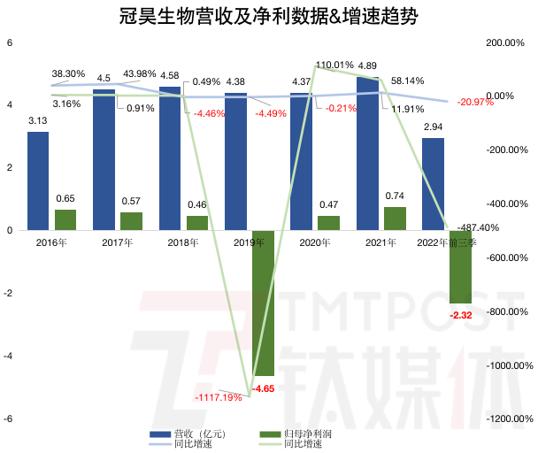 根据半年报,冠昊生物计提了高达2.14亿元的商誉减值损失,同时计提存货跌价损失6247.62亿元,再叠加其他资产减值损失,公司累计资产减值损失2.768亿元。到三季度末,冠昊生物资产减值损失达到2.774亿元,同比增加16731.99%。