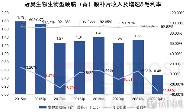 对于冠昊生物来讲,传统本业虽然普遍毛利率较高,但增长缓慢。以亿元大单品生物型硬脑(脊)膜补片为例,毛利率一直在91%至上,但增长却不稳定,甚至在今年上半年同比大幅下滑32.66%,钛媒体App查阅历年数据发现,生物型硬脑(脊)膜补片的表现相当不稳定,其收入在2015年达到峰值的1.79元,占比营业收入79.29%,之后再未超越。