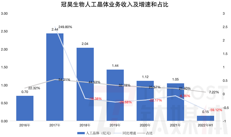 不过随着人工晶体被纳入集采,冠昊生物的人工晶体业务也逐年缩水,2019年至2021年,营收分别降至1.44亿元、1.12亿元、1.05亿元,占营收比重各为32.79%、25.57%、21.40%。