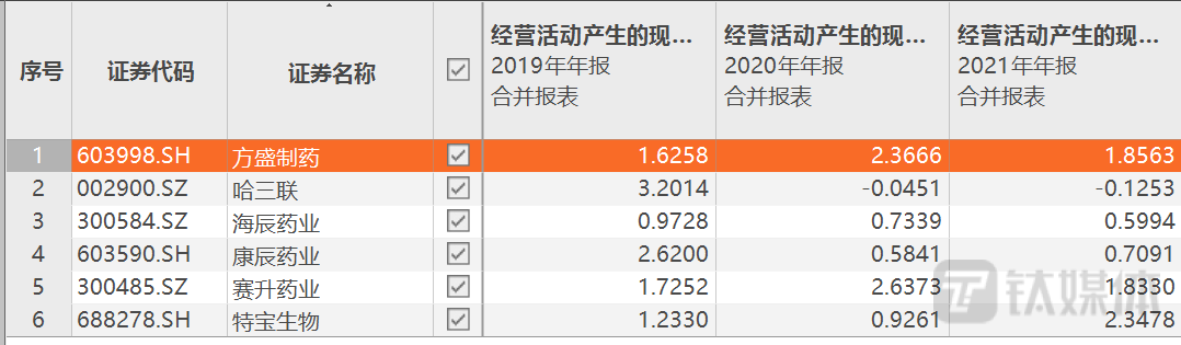 需要指出的是,南新制药曾在其招股说明书中披露,其同行可比公司分别为方盛制药、哈三联、海辰药业、康辰药业、赛升药业、特宝生物,而上述公司2019年-2021年经营活动产生的现金流量净额具体如下: