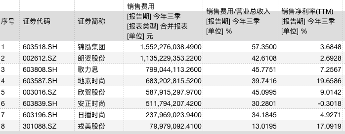 与同行相比,歌力思在销售费用上的投入也不算少。从绝对金额看,今年前三季度,歌力思的销售费用仅次于锦泓集团、朗姿股份,高于地素时尚、安正时尚;从销售费用占营收比重看,歌力思的销售费用率仅次于锦泓集团。